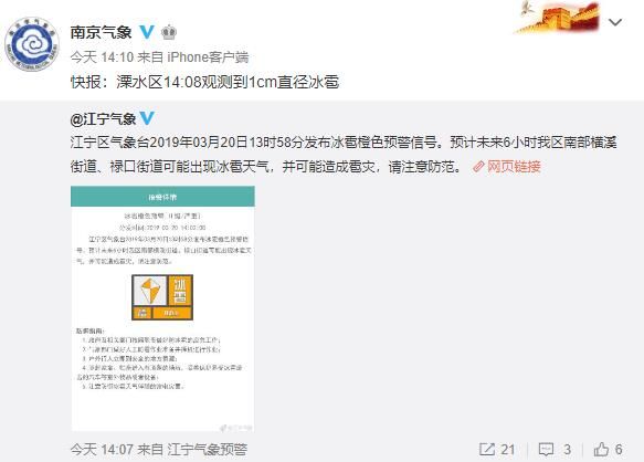 其中,南京溧水区14:08观测到1cm直径冰雹。