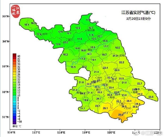 气温方面,下午15时,江苏东山的气温已经到达29℃,热到仿佛已经到了夏天。而沿淮和淮北地区的气温较低,西连岛的气温仅有10.5℃。