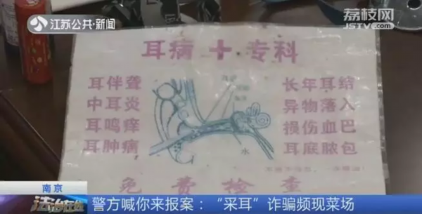 最近,南京六合警方发现一作案团伙,在六合区雄州街道各菜场内以给他人挖耳朵为手段,骗取高额费用,少则几百元,多则上千元。