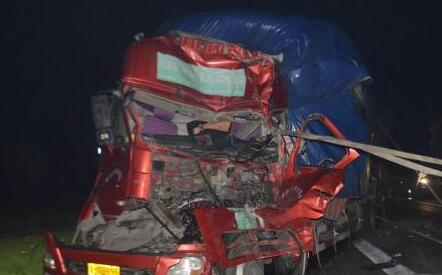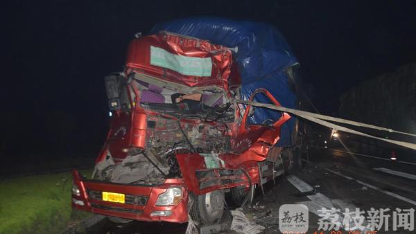 事发当晚,海安市228国道金港大道红绿灯路口发生一起交通事故,一辆在路口等红绿灯的大挂车被一辆货车撞上,货车前部严重损毁,货车驾驶员受重伤。