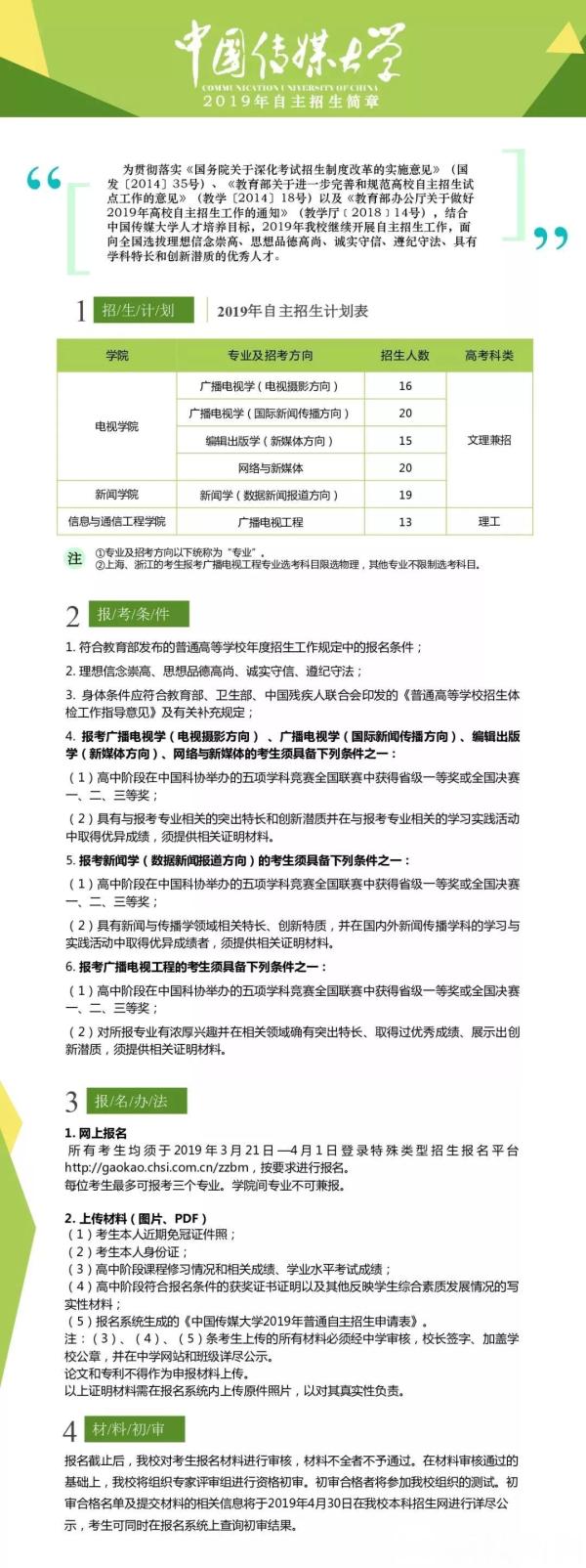 中国传媒大学2019年自主招生简章公布,简章中同样对五大学科竞赛要求“省一”。学校对江苏考生的优惠政策为“模拟投档线下13分且达到本一省控线”,选测科目等级要求为B+、B及以上。