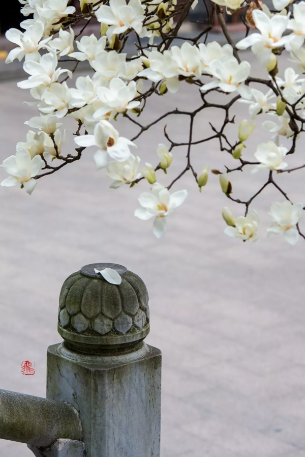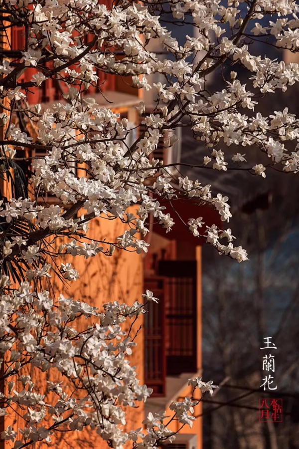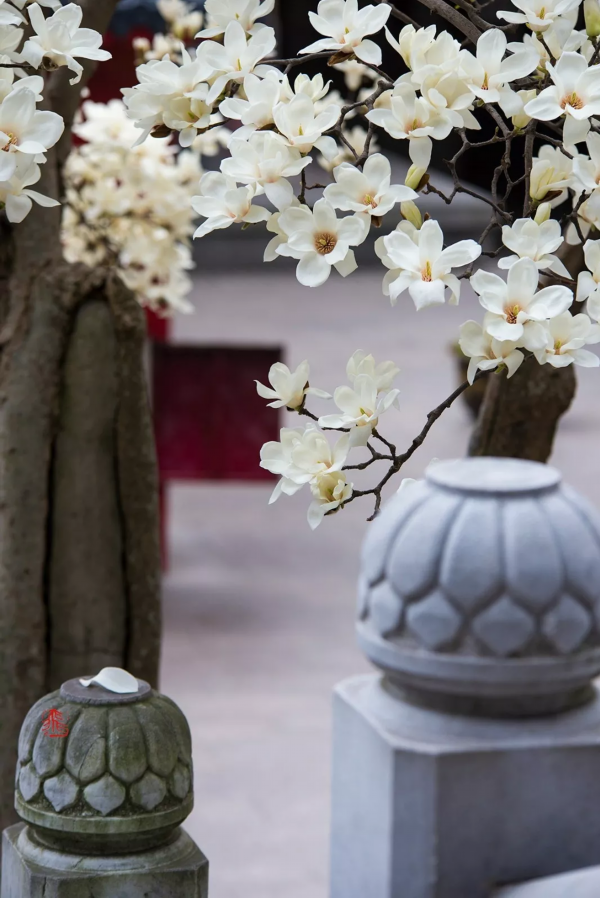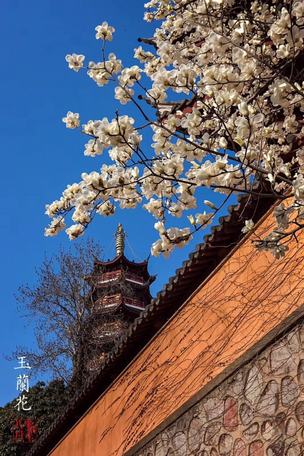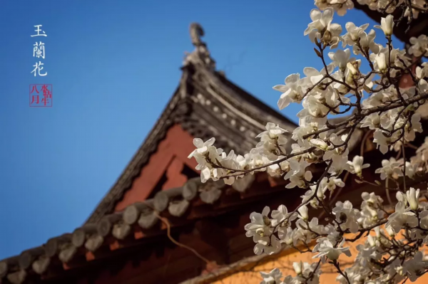 “霓裳片片晚妆新,束素亭亭玉殿春。”灵谷寺的玉兰花每到春天,花开满庭。