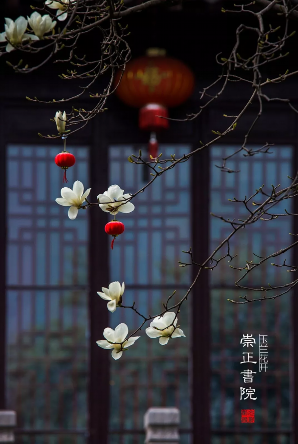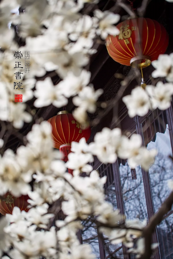 崇正书院前的玉兰被几盏红灯笼点亮,亭亭如盖,呈现“一树千花”奇景。
