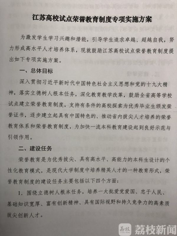 我苏网讯 荣誉教育是为优秀拔尖、具有高水平、高能力的本科生设计的个性化教育模式,是现代大学制度中培养精英人才的一种教育形式。今天(3月22日)上午,江苏省教育厅下发专项实施方案,鼓励省内高校试点建立荣誉教育制度,选择优秀大学生进入荣誉教育培养体系,为其提供跳级、提前毕业、本硕贯通培养、短期访学等服务。