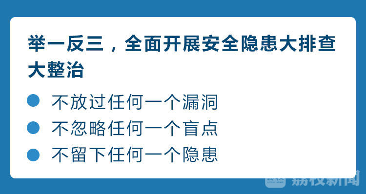 会议指出,要举一反三,全面开展安全隐患大排查大整治。各地各部门要按照省两办关于做好危化品等重点行业领域安全生产的紧急通知要求,对所有危化品生产、经营、仓储、运输企业开展深入排查,对危险程度较高、事故易发多发的生产工艺环节和部位进行严格监管,确保不放过任何一个漏洞、不忽略任何一个盲点、不留下任何一个隐患。同时,要对各领域、各行业、各场所特别是交通、燃气、电力、食品药品等重点行业领域,医院、学校、车站、机场、文娱场所、建筑工地等重点场所,开展安全隐患大排查。凡是存在安全漏洞和风险隐患的,一律停产整改;限期整改依然不合格不合规的,要坚决关停;履职不尽责、监管不到位的,要依法依规追究责任。
