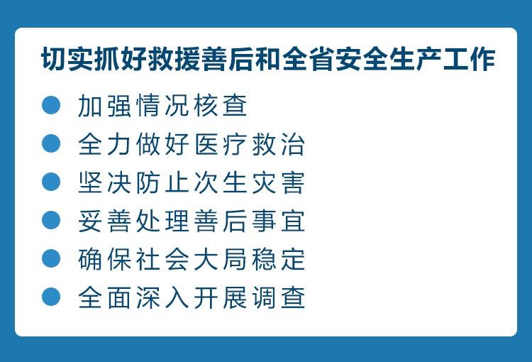 会议指出,要坚决深入贯彻落实习近平总书记等中央领导同志重要指示批示,认真落实王勇国务委员代表党中央、国务院提出的要求,以对人民群众极端负责的精神,切实抓好救援善后和全省安全生产工作。要加强情况核查,继续开展网格化、地毯式搜救,绝不放过任何一个角落,绝不放弃任何一个生命。要全力做好医疗救治,集中最顶尖专家、调配最优质资源,尽最大努力挽救生命、减少因伤致残。要坚决防止次生灾害,加强预警监测,持续做好现场及周边空气、水、土壤的检测监测和危化品处置疏运回收、卫生防疫消杀等工作,有效控制污染源,按规处置被污染的水体,所有非专业救助人员不得进入现场,注意做好现场救援人员的防护。要妥善处理善后事宜,组织精干力量,耐心细致、将心比心地做好抚恤赔偿工作,及时稳妥化解矛盾,抓紧做好周边房屋、校舍等的修缮和加固,保证中小学生正常上课。要确保社会大局稳定,及时回应社会关切和舆论关注,把党中央、国务院的关怀,把事故救援善后情况,把事故点周边环境监测情况,准确客观地向社会权威发布。要积极配合国务院事故调查组,全面深入开展调查,彻底查清事故原因,不论涉及到谁都要依法依规严惩,给人民群众一个负责任的交代。