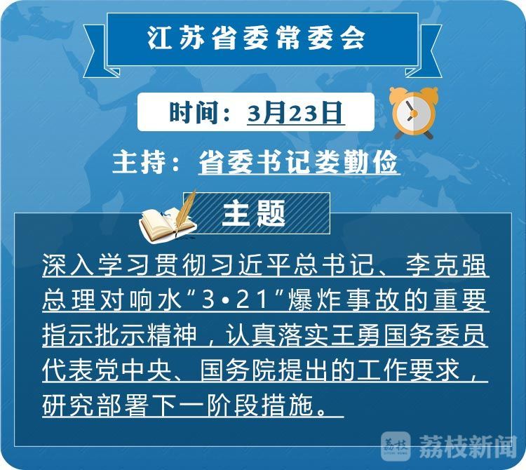 荔枝新闻讯 3月23日,江苏省委常委会召开会议,深入学习贯彻习近平总书记、李克强总理对响水“3•21”爆炸事故的重要指示批示精神,认真落实王勇国务委员代表党中央、国务院提出的工作要求,研究部署下一阶段措施。