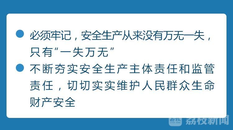 会议指出,要深刻汲取血的教训,从灵魂深处进行反思。这次特大爆炸事故,是企业安全生产主体责任未有效落实造成的恶果,是监管中形式主义官僚主义酿成的苦果。惨痛的教训再次警示我们,一定要深入贯彻习近平新时代中国特色社会主义思想,牢固树立以人民为中心的发展思想,做实做细做好防范化解重大风险各项工作。必须牢记,安全生产从来没有万无一失,只有“一失万无”,任何时候这根弦一丝一毫都不能放松,半点也不能麻痹和侥幸。要不断夯实安全生产主体责任和监管责任,切切实实维护人民群众生命财产安全。