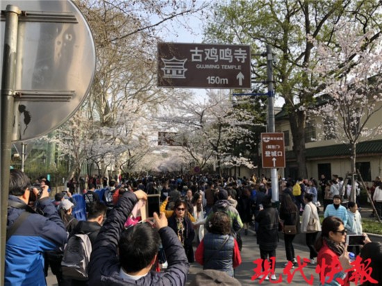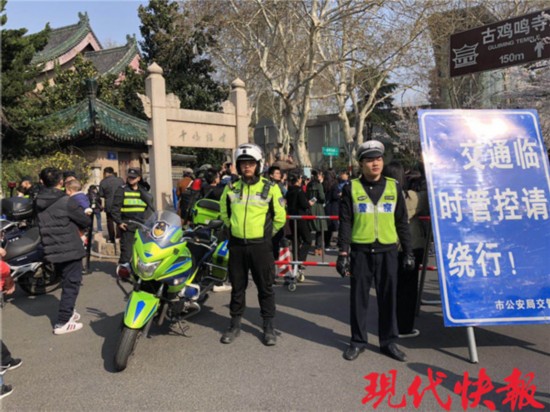 24日现代快报记者获悉,从早上8点钟开始,交警部门就已经对鸡鸣寺周边路段实行交通管制。“因为前一天周六来鸡鸣寺赏花的市民爆棚,交通管控措施一直实行到晚上10点钟左右才结束。”南京交警一大队民警文明对记者说,周六为了有效保障鸡鸣寺周边道路的正常通行,很多民警在岗连续工作了10多个小时,连吃饭都是在岗位上完成的。