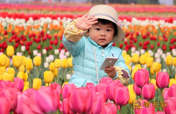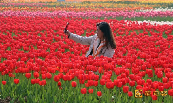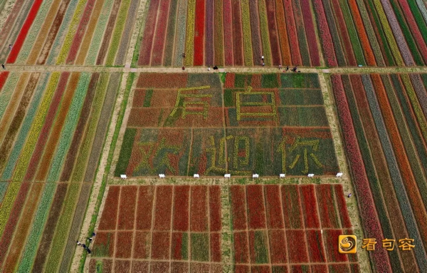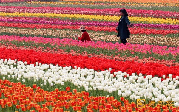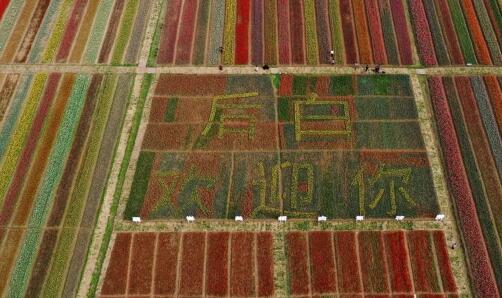 整个郁金香花田里,花团锦簇,艳丽芬芳,数百万棵郁金香迎风摇曳,花香四溢,缤纷绚丽。从空中俯瞰,不同品种,不同色彩的郁金香仿佛为大地装扮上美丽的彩带,用郁金香种植的“后白欢迎你”的几个大字格外醒目,令人震撼。闻着浓郁的花香,游客们穿行在花田小径间,体验“人在花中走,如在画中游”的美妙感受,纷纷拿出手机或相机拍下一朵朵鲜花与一张张笑脸。