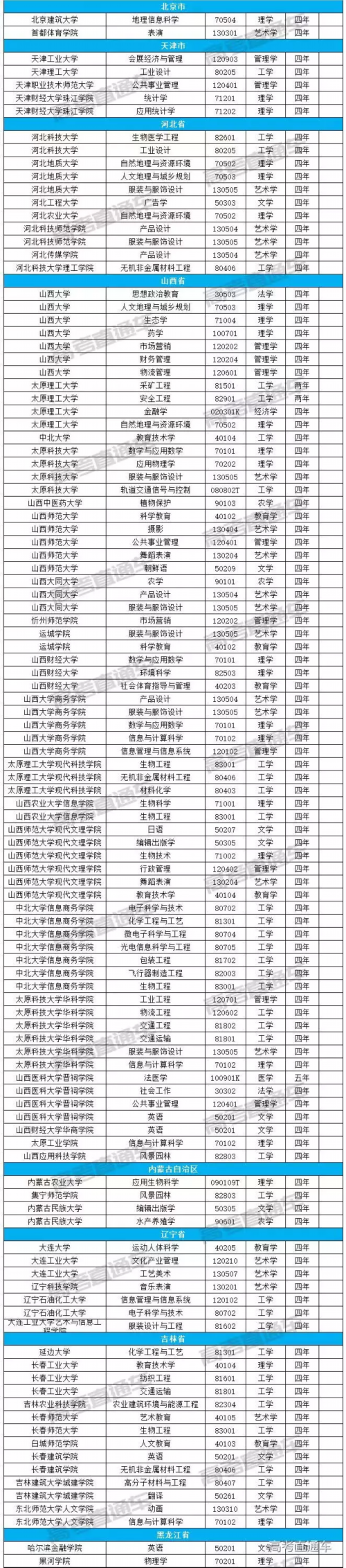 调整学位授予门类或修业年限专业名单