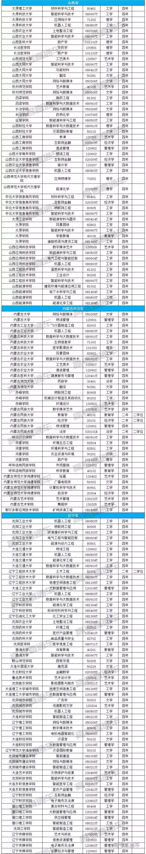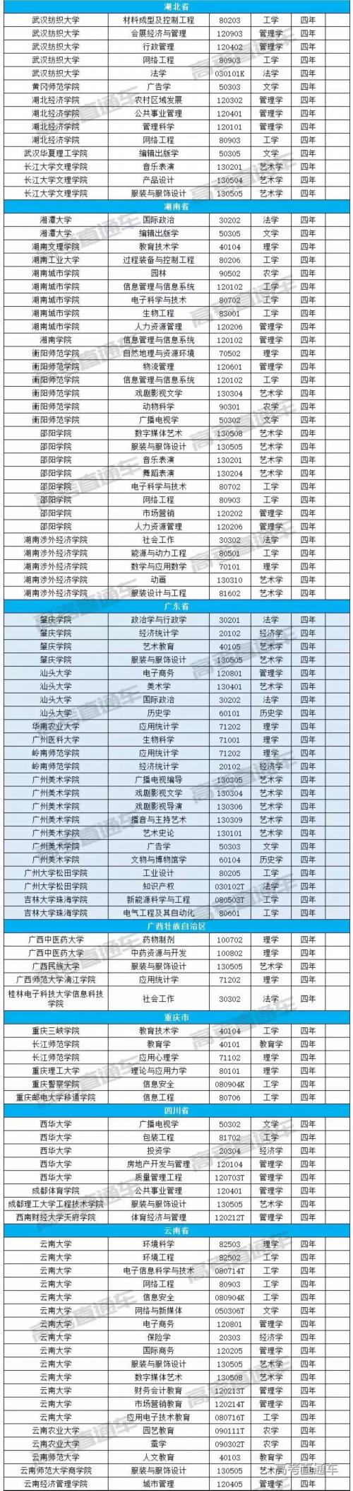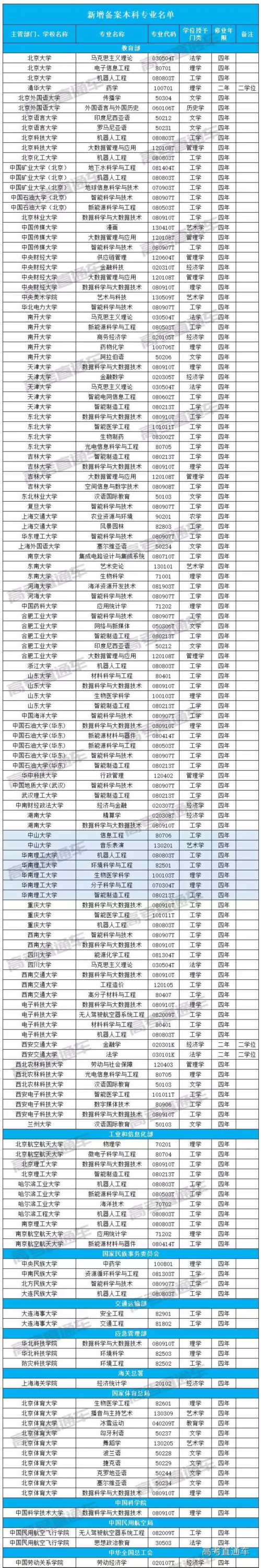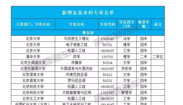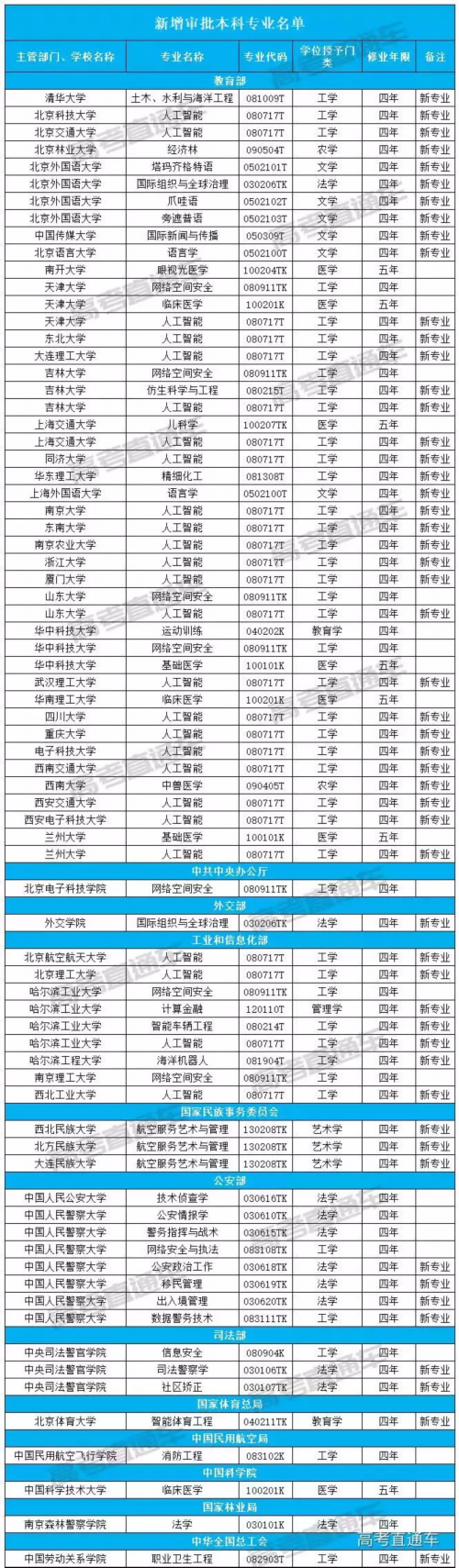 近日,教育部公布2018年度普通高等学校本科专业备案和审批结果的通知。其中包括:新增备案本科专业名单(1831个)、新增审批本科专业名单(241个)、调整学位授予门类或修业年限专业名单(40个)、撤销本科专业名单(416个)。全国新增的2072个本科专业,今年高考均可报。
