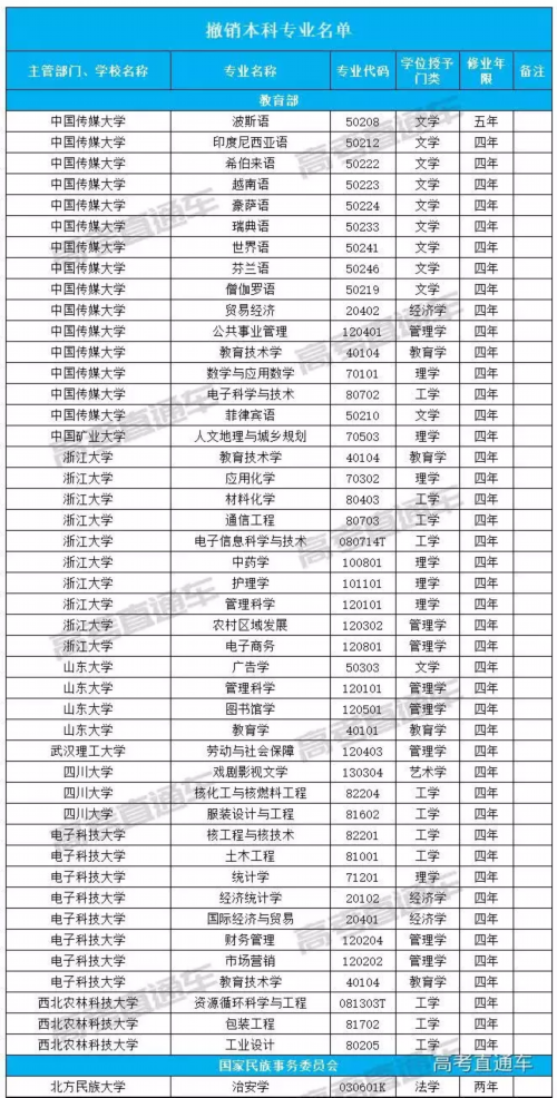 撤销本科专业名单