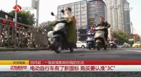 另外《电动自行车安全技术规范》将从4月15日起实施。新国标规定,电动自行车最高车速由每小时20公里调整为25公里;含电池在内的整车质量由40公斤调整为55公斤;电动机连续输出功率由240瓦调整为400瓦,同时必须具备脚踏骑行功能。新规实施后,消费者购买时可通过3C标志来判断产品是否合格。