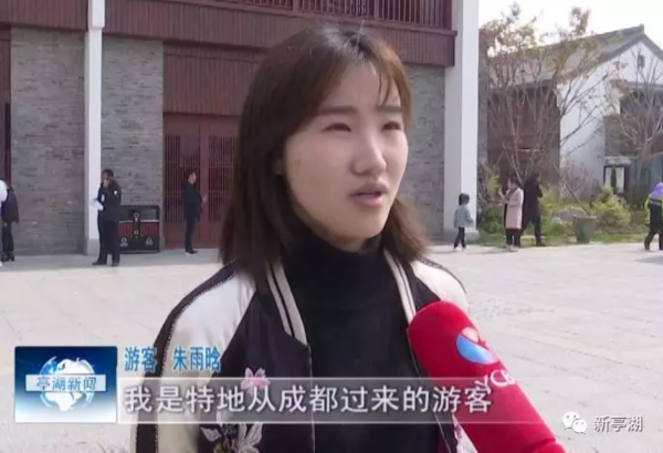游客朱雨晗:我是特地从成都过来的游客,然后感觉我们盐城大洋湾的樱花非常的美。