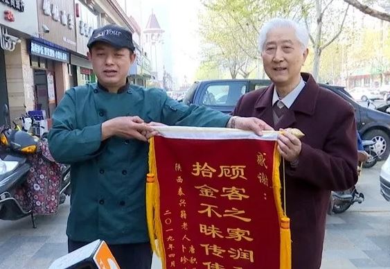 8000元算不上巨款,但却让老人一家感动万分。4月6日上午,夫妻俩来到早餐店,亲手将锦旗送到王海兵手中,同时老人还表示,想见见第一个捡到现金的那位老人,当面表示感谢。