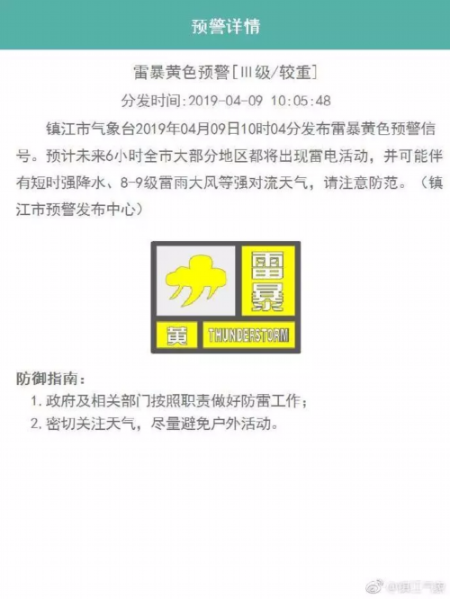 02镇江市气象台2019年04月09日10时04分发布雷暴黄色预警信号。预计未来6小时全市大部分地区都将出现雷电活动,并可能伴有短时强降水、8-9级雷雨大风等强对流天气,请注意防范。(镇江市预警发布中心)