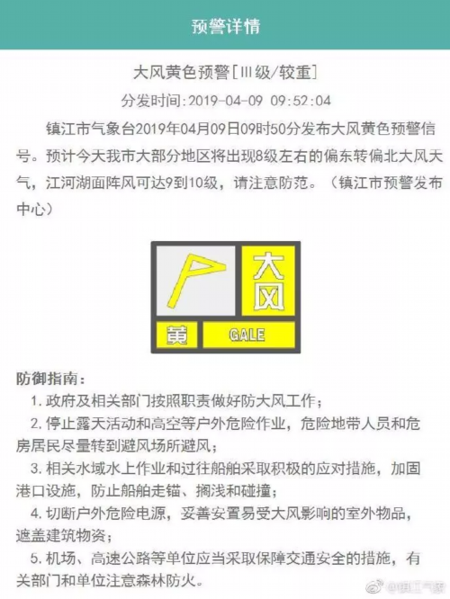 01镇江市气象台2019年04月09日09时50分发布大风黄色预警信号。预计今天镇江大部分地区将出现8级左右的偏东转偏北大风天气,江河湖面阵风可达9到10级,请注意防范。(镇江市预警发布中心)