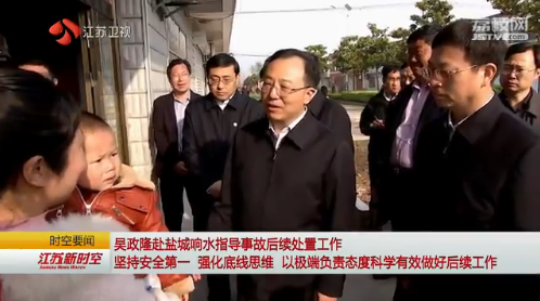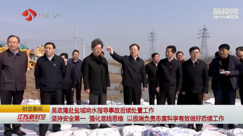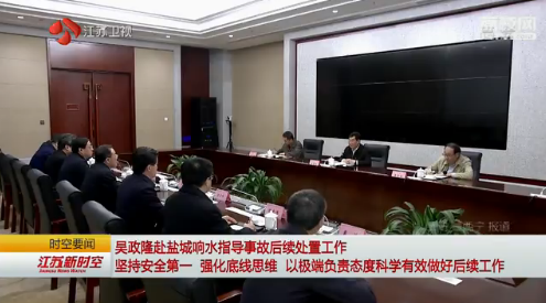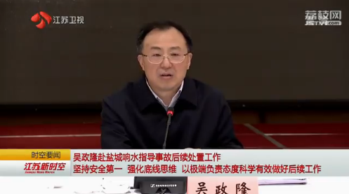 在响水期间,吴政隆主持召开专题会议。在听取情况汇报后,他说,连日来,大家不怕牺牲、不怕疲劳,连续作战、攻坚克难,处置工作取得阶段性重要进展。虽然经受住前几天降雨考验,但随着温度逐渐升高,雨季汛期即将来临,现场清理工作将十分艰巨繁重,必须做好万全准备,以极端负责态度打好后续处置攻坚战、持久战,当务之急要打赢化学品转运处置、环境污染治理、现场设备设施拆除三场硬仗。要继续全力做好医疗救治、事故现场管控、善后和维护社会稳定等工作。要举一反三、亡羊补牢,深入开展安全生产隐患大排查大整治,切实做到隐患见底、措施到底、整改彻底。