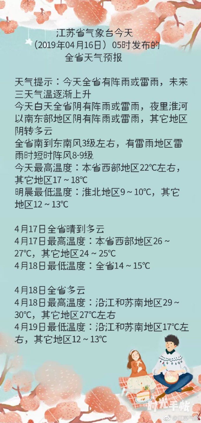 今天白天全省阴有阵雨或雷雨,夜里淮河以南东部地区阴有阵雨或雷雨,其它地区阴转多云