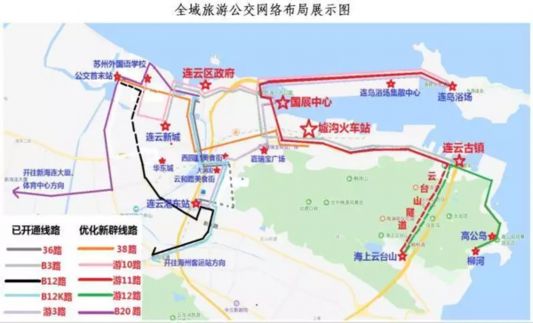 此次连云区优化、新辟的5条全域旅游公交线路分别为38路,游10路、游11路、游12路和B20路。