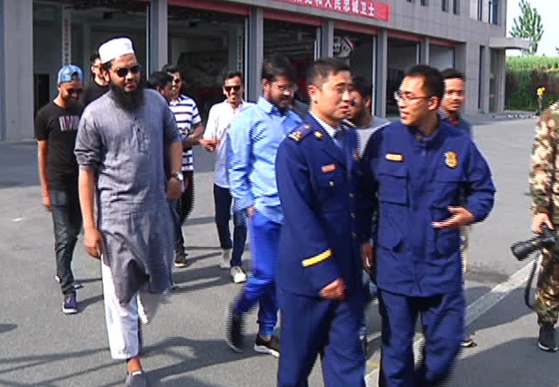 当然,除了水带连接训练,特勤中队的消防员还给留学生们展示了消防专用的32米云梯车、水上救援车等等,还让他们穿上了特制的消防服装,体验了一把当消防员的感觉。今年22岁的留学生又书付告诉记者,他来自孟加拉,不论在自己国家还是在中国,这都是他第一次来消防部门体验参加,感觉很奇妙。