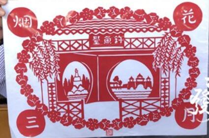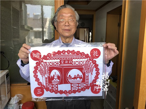 钓鱼台、白塔、五亭桥……这是扬州一对老人创作的名为“烟花三月”的剪纸作品。