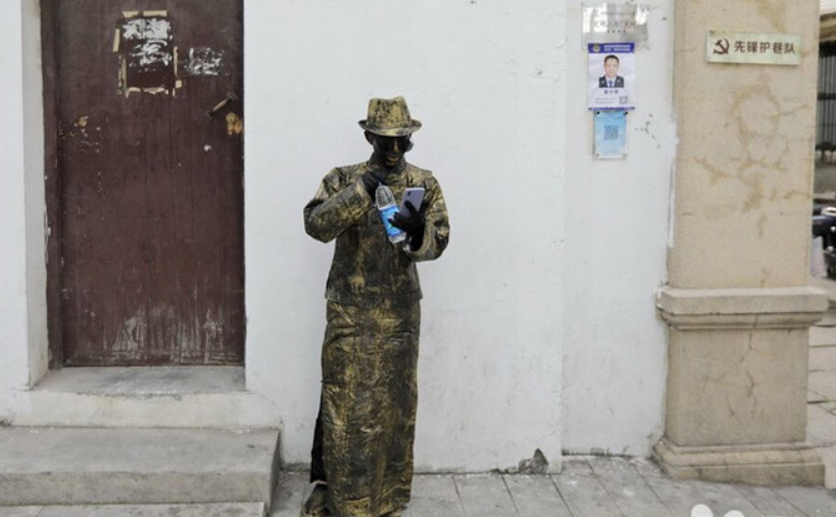 身穿马褂、戴着墨镜、轻摇折扇,5月7日下午,一个全身刷满铜漆颜料的“小铜人”悠哉行走在初夏的苏州街头,吸引了不少路人的眼球。有趣的是,“小铜人”一手摇扇一手拿着手机,不停对着手机屏幕说话——原来是街头艺人正在进行手机直播。