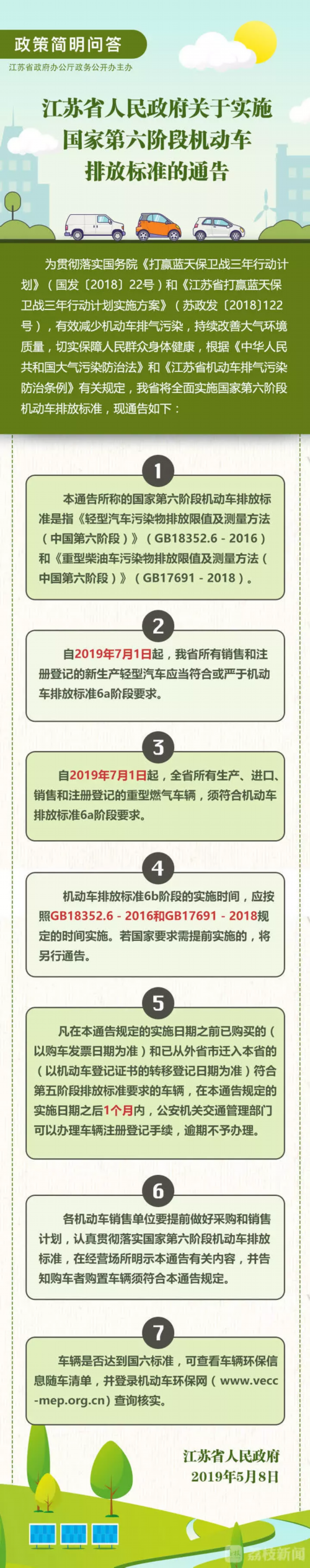 近日,江苏省印发《关于实施国家 第六阶段机动车排放标准的通告 》(下称《标准》)。它的发布意味着我市将跟随全省步伐,7月1日起全面实施国家第六阶段机动车排放标准。