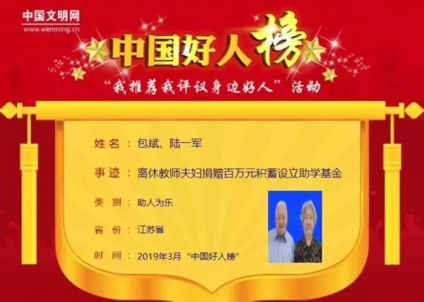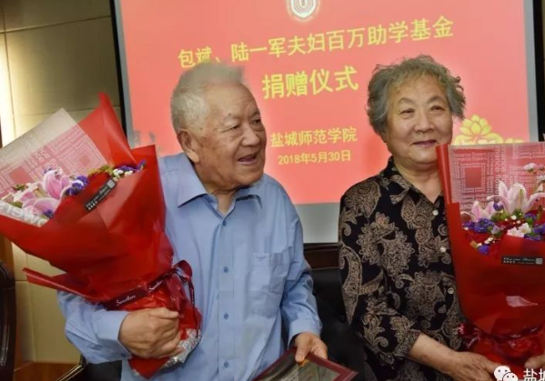 2018年5月30日下午,已是93岁高龄的离休教师包斌及其妻子陆一军,再次将他们多年积蓄下来的100万元人民币一次性捐出,在学校设立助学基金,从当年开始每年资助20位学生,每年资助每个学生5000元,直至他们毕业。