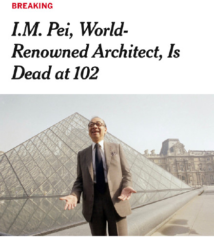 然而,不幸的是,5月17日早间央视新闻援引外媒的报道,当地时间5月16日,这位创造玻璃金字塔的华裔建筑大师贝聿铭去世,享年102岁。