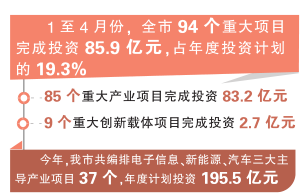 记者昨天从市发改委获悉,今年以来,我市重大项目建设按下“快进键”,亮点纷呈,提升了全市经济发展硬实力。据统计,1至4月份,全市94个重大项目完成投资85.9亿元,占年度投资计划的19.3%。其中,85个重大产业项目完成投资83.2亿元,9个重大创新载体项目完成投资2.7亿元。