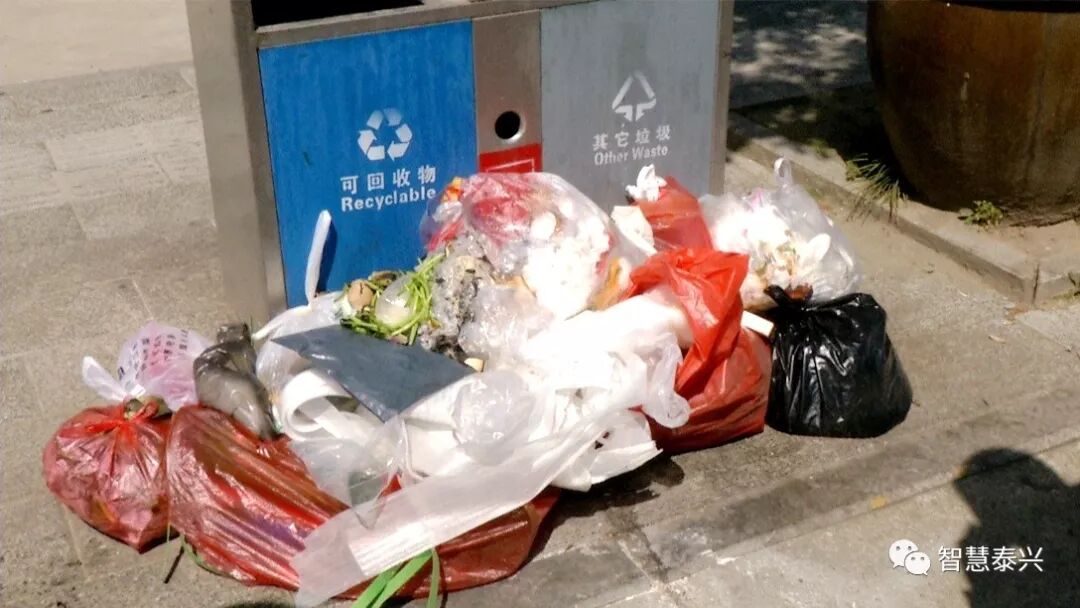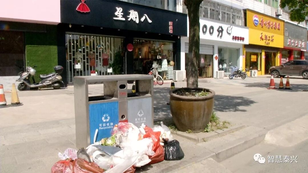 兴燕路边明明设置了垃圾桶,但沿街的商铺、路边的摊贩,直接把垃圾倒在垃圾桶的外侧。
