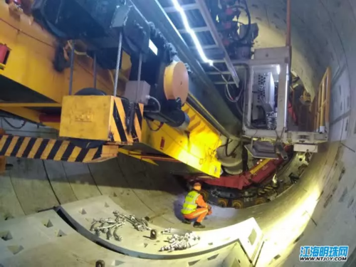 在现场,随着螺旋机的推进,被绞出来的泥土经过输送带,传送到渣土箱,最终被运输出去。不到两个小时,盾构机掘进1米多,施工人员开始安装管片。