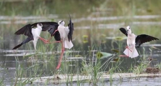 黑翅长腿鹬在藕田内嬉戏打斗