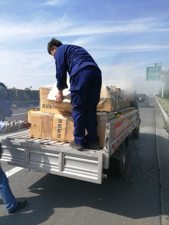 当天下午两点半左右,在S19通锡高速上,一辆小货车一边行驶一边在冒烟,车厢内装满了货物。眼看火要烧大,正巧这个场面被贠晨看到了,出于职业敏感,贠晨立即拦下了小货车,并让司机停靠到应急车道。