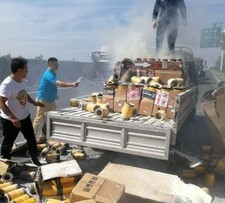 第一时间拨打119报警后,贠晨迅速从他驾驶的车上拿出灭火器,对准车上冒烟的位置喷射灭火剂,但由于火苗是从车厢底部蹿上来的,车厢内又载满了用纸箱装的胶带,十分易燃。眼看着货物堆上的火就要烧大了,为了防止火势引起货车着火,贠晨和货车司机以及正好经过的高速公路维保人员一起将车厢内的货物卸下,堆放到应急车道上,再进行灭火。十五分钟后,经过在场人员合力施救,火势终于被控制住了。