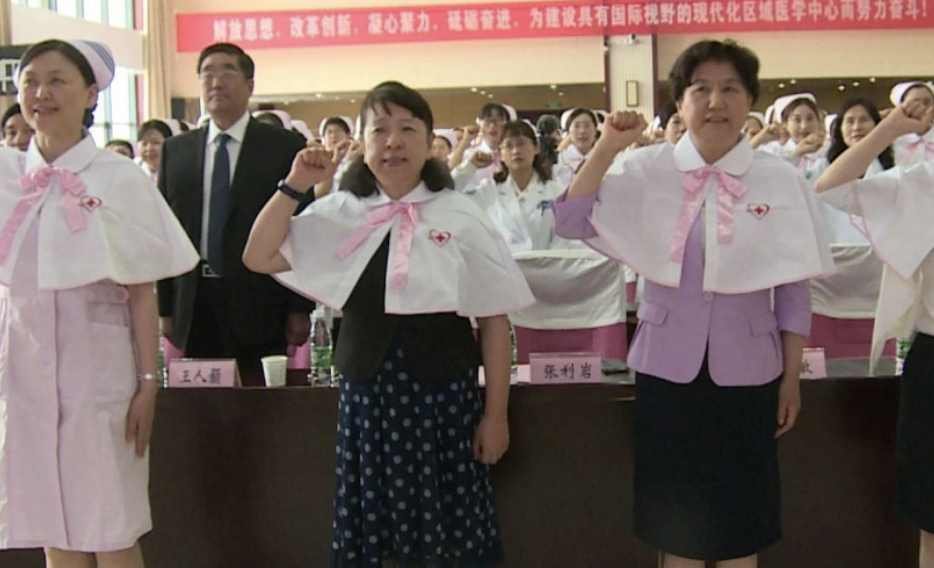 "我志愿成为一名光荣的护理志愿者......"400名护士代表肃立在南丁格尔的画像前,郑重宣誓。5月28下午,经中国南丁格尔志愿护理服务总队的批准,徐州医科大学附属医院成为中国南丁格尔志愿护理服务总会的第403支分队。