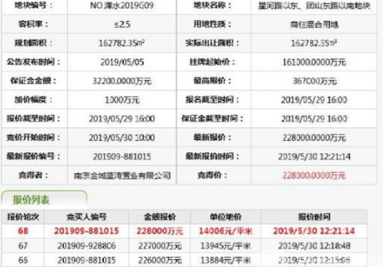 我苏网讯 今天上午,南京溧水区再次迎来土地拍卖。位于城北开发区星河路以东、团山东路以南G09地块,最终经过68轮竞拍,被南京金域蓝湾置业有限公司(万科地产)以总价228000万元拿下,成交楼面价5603元/平米。地块现状平整,紧靠地铁站、新建小学等配套,居住条件相对成熟。