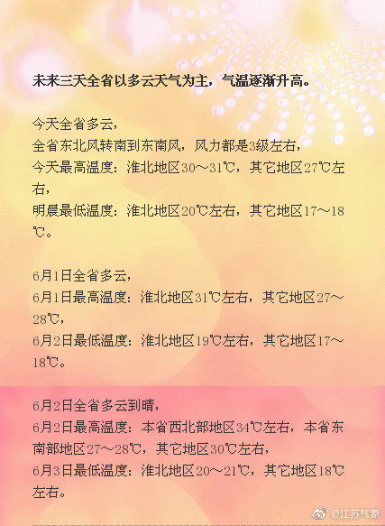 今天(5月29日)江苏全省多云,全省东北风转南到东南风,风力都是3级左右,今天最高温度:淮北地区30~31℃,其它地区27℃左右,明晨最低温度:淮北地区20℃左右,其它地区17~18℃。