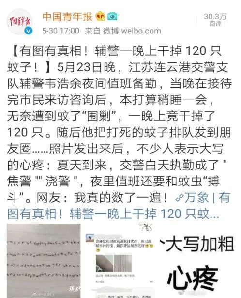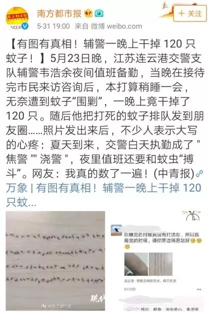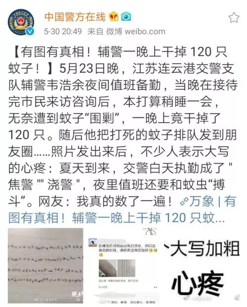 原来,5 月 28 日连云港交警支队海州三大队的一名辅警,在夜间值班备勤期间一晚上竟然就干掉了 120 只蚊子!有图有真相!
