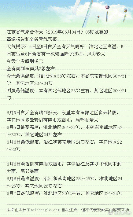 4日至5日白天全省天气晴好,淮北地区高温,5日夜里至6日全省有一次较强降水过程,风力较大。今天全省晴到多云,全省南到东南风3级左右,今天最高温度:淮北地区36℃左右,本省东南部地区30~31℃,其它地区33~34℃,明晨最低温度:本省西北部地区23℃左右,其它地区20~21℃。