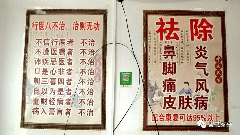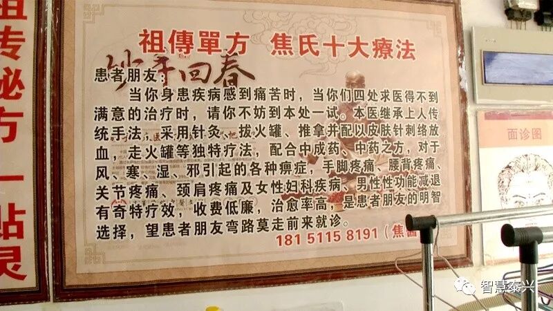推拿店里张贴着“祖传秘方一贴灵”的宣传画,还有“医德高尚,妙手回春”的锦旗。执法人员介绍,推拿店里张贴这些与医疗有关的宣传画就涉嫌非法行医,当即要求撤销店里的宣传画。
