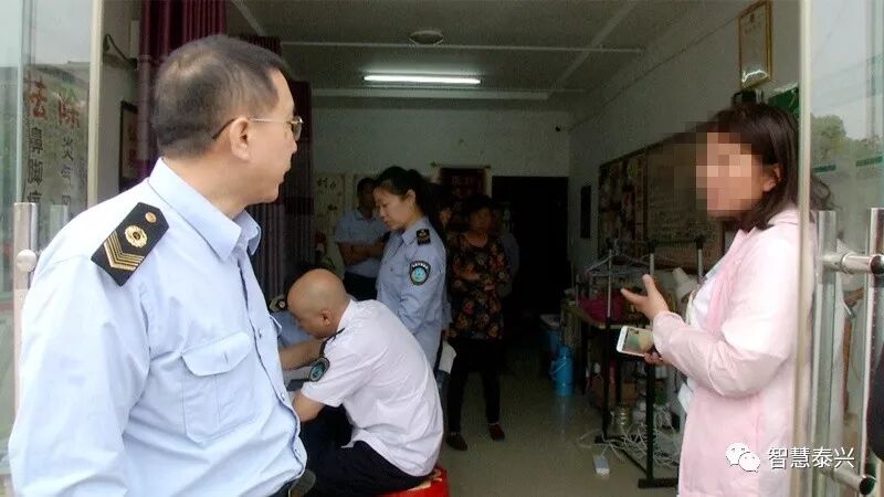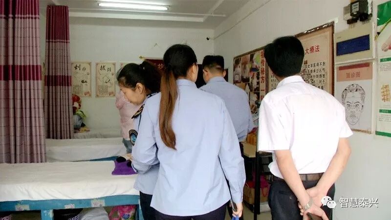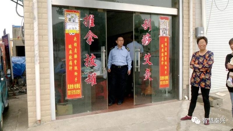 在检查中,位于宣堡镇政府对面的一家推拿店涉嫌非法行医,执法人员现场责令停止营业。