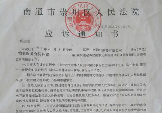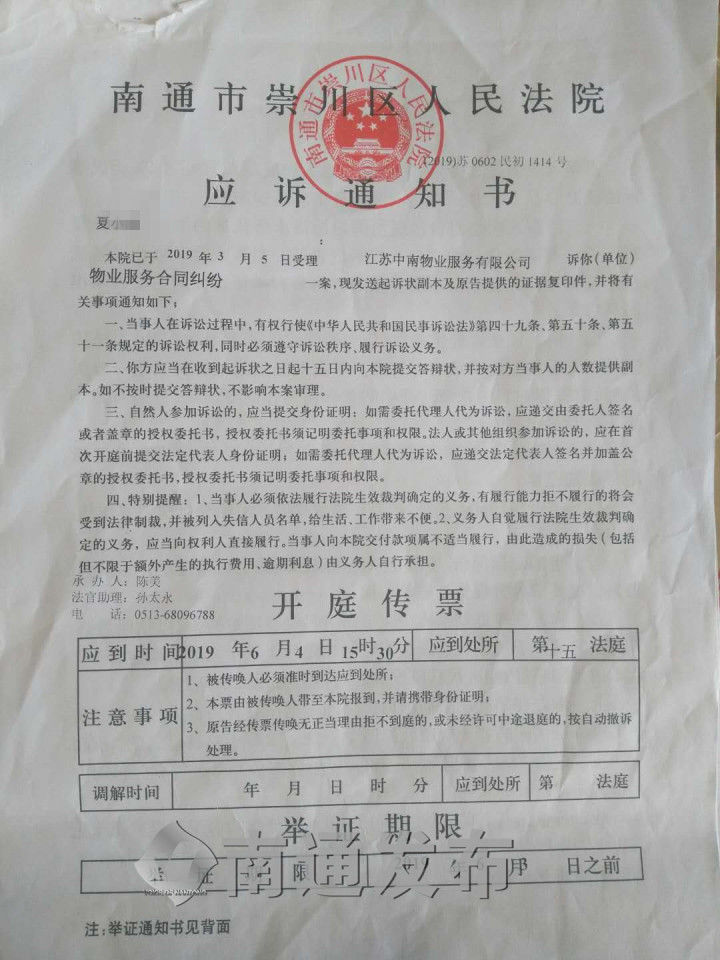 接到法院传票后,夏先生于6月4日开庭时间赶到了崇川区人民法院应诉。可是,他和家人匆匆赶到法院后,发现原告中南物业相关人员久候不至;一问,对方已经悄悄撤诉!