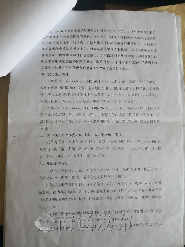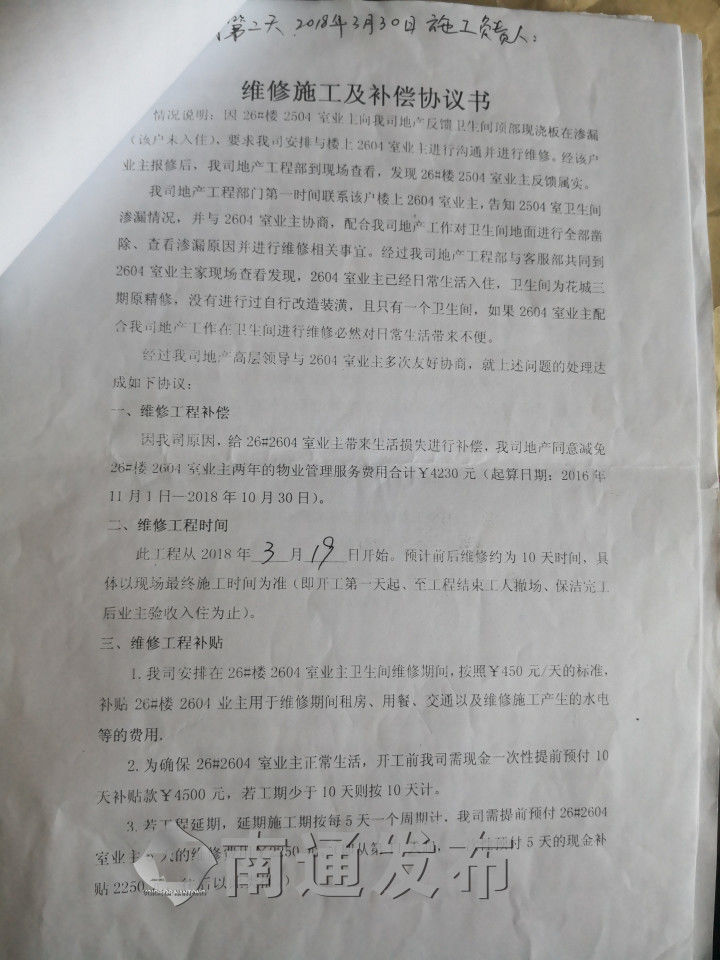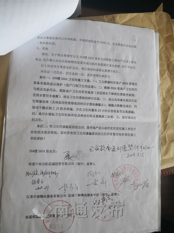 夏先生介绍,他于2015年在中南世纪花城购买了一套精装修的房屋。“没想到,我家房子自从2015年11月拿钥匙以后,各种糟心事就没中断过。不夸张地说,房屋质量很差逢雨必漏,连续维修了3年直至2018年7月才修好,其中一个小房间的地板全都膨胀空鼓了。后来,又因为花城三期精装房质量不好导致我家楼下住户漏水,因牵涉到我家,为了楼下居民的维修又在我家折腾了近半个月时间,导致那段时间我们有家不能回。为了弥补给我们带来的不必要麻烦和损失,中南物业和我们签订了一份补偿协议,承诺补贴我家4500元。”