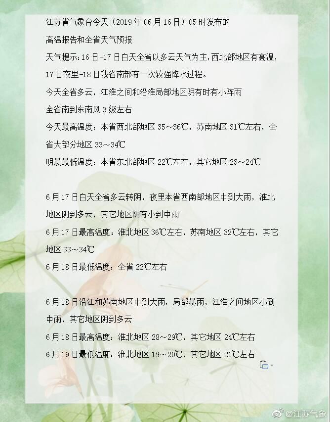 据江苏气象最新消息,16日-17日白天全省以多云天气为主,西北部地区有高温,17日夜里-18日我省南部有一次较强降水过程。