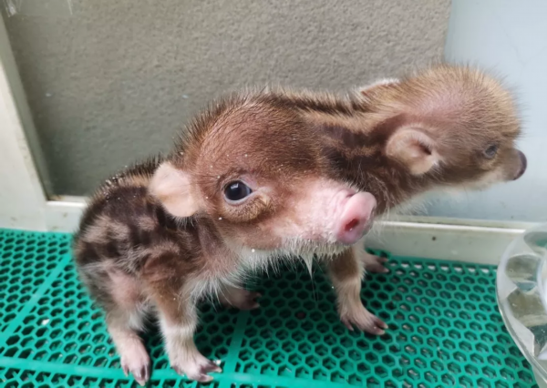 两只小野猪身长只有20cm左右,全身长着绒毛,背部有着深棕色条纹,大大的脑袋,粉嫩的鼻子,非常可爱。