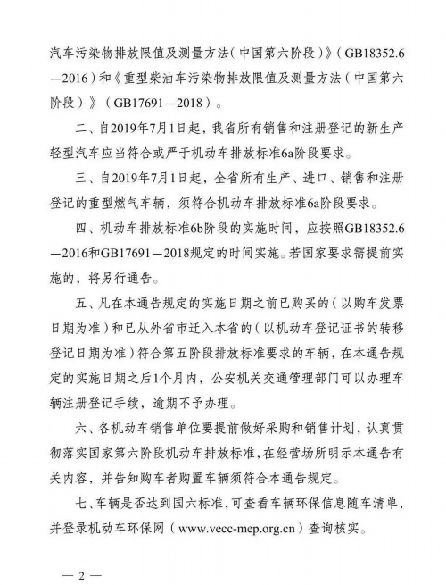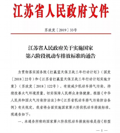 根据江苏省人民政府《关于实施国家第六阶段机动车排放标准的通告》要求,7月1日起江苏省将全面实施国家第六阶段机动车排放标准。