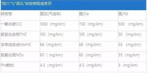 “国六”与“国五”排放物限值差异在于一氧化碳CO、非甲烷总烃NMHC、氮氧化物NOx、 PM颗粒、 碳氢化合物THC都大幅度减少。